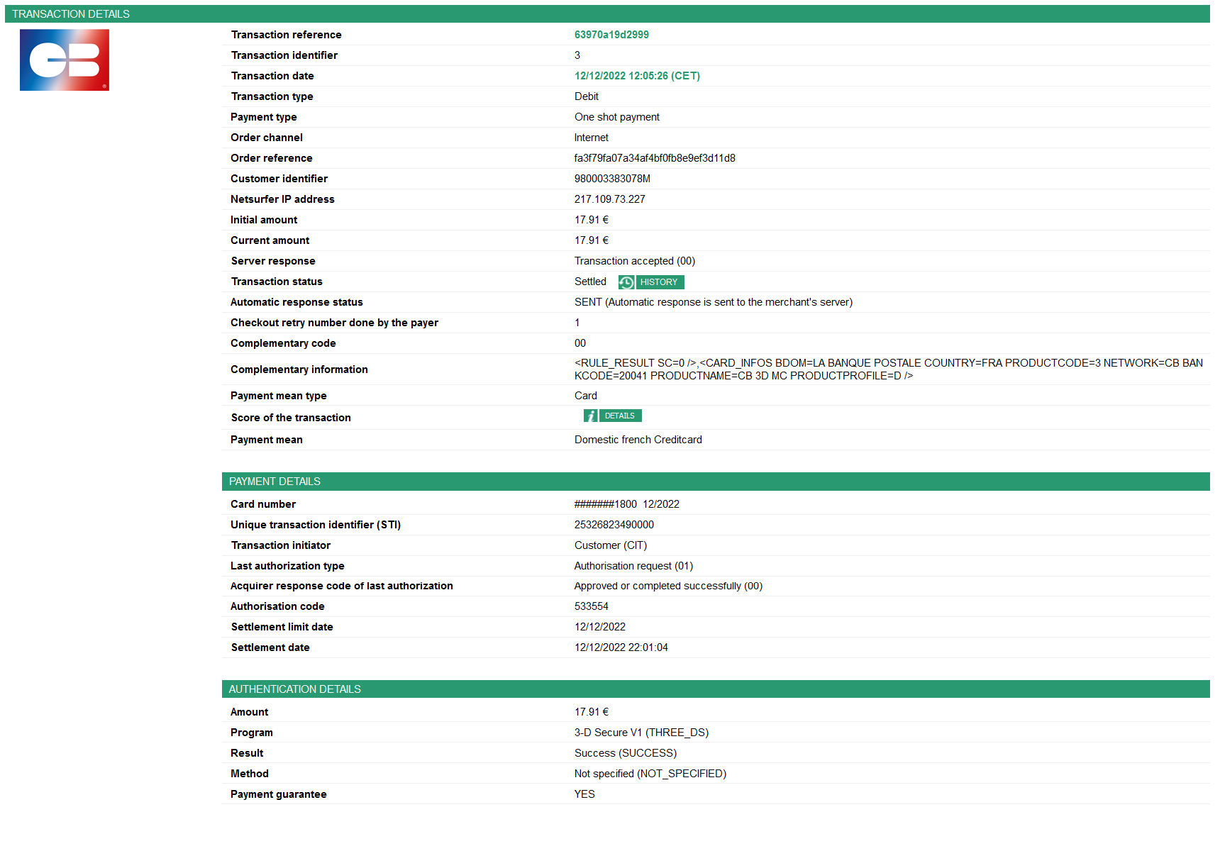 With European PSD2, 3-D Secure authentication is now mandatory. When processing a payment, the cardholder must prove that he is the actual owner of the CB card he is using. The way of how the cardholder authenticate himself depends on the issuer bank and on fraud consideration.