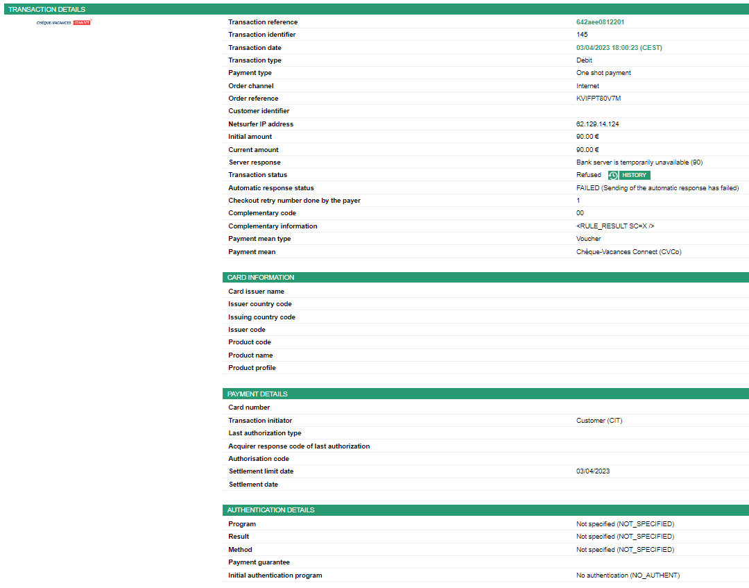 The payment with CB complement is subject to a 3-D Secure payment process. If the card complement is not accepted or the 3-D Secure authentication is not successful, the entire transaction is cancelled and the amount of the prepaid mean of payment is not consumed.