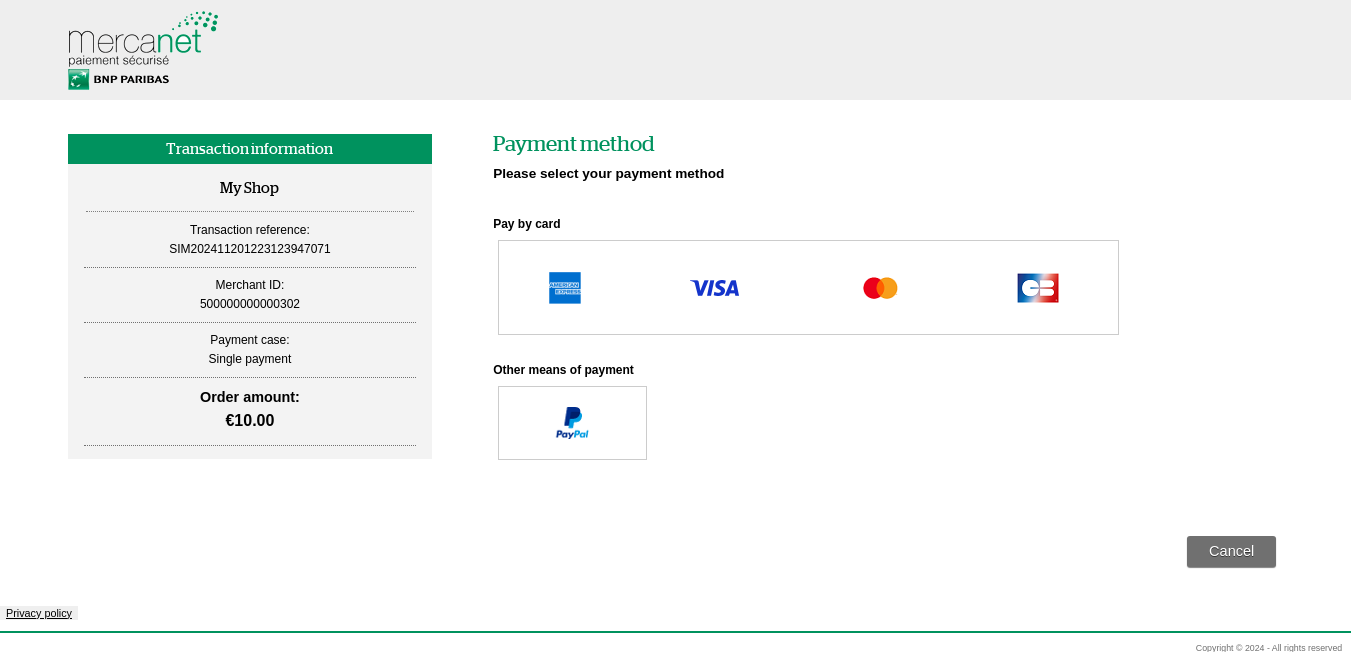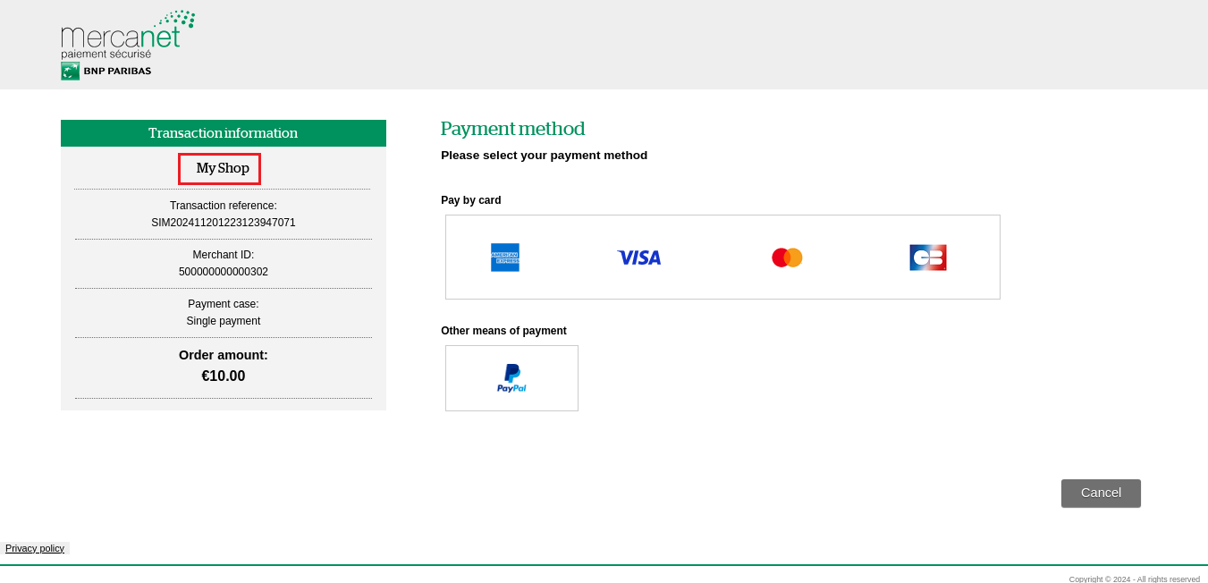 Mercanet is a secure multi-channel e-commerce payment solution that complies with the PCI DSS standard. It allows you to accept and manage payment transactions by taking into account business rules related to your activity (payment upon shipping, deferred payment, recurring payment, payment in instalments, etc.).