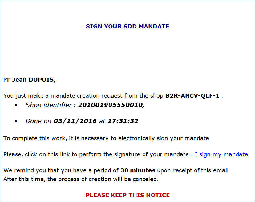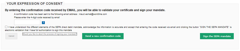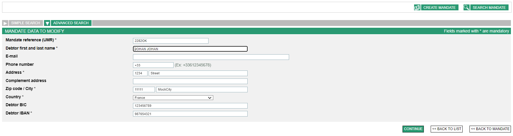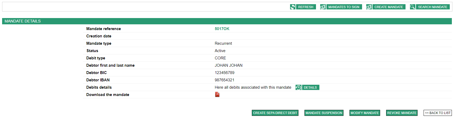 | Revoke | You can revoke an active mandate, i.e. remove it from the mandate database. This means you will not be able to carry out any actions on this mandate, either in terms of management or creation of direct debits. You will therefore only be able to view the mandate and the associated SEPA direct debits for 14 months. | ![]() |