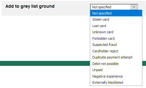 The right-hand part of the table shows the action that can be performed on a transaction for which the card has been greylisted.
