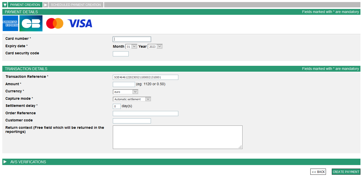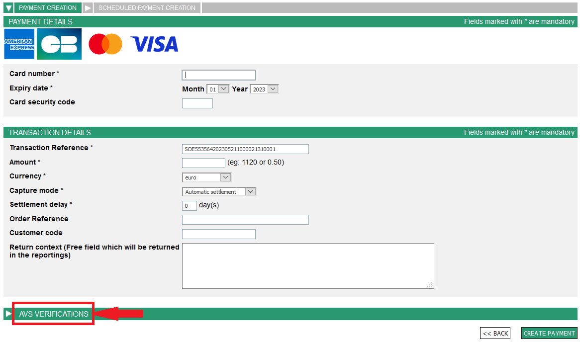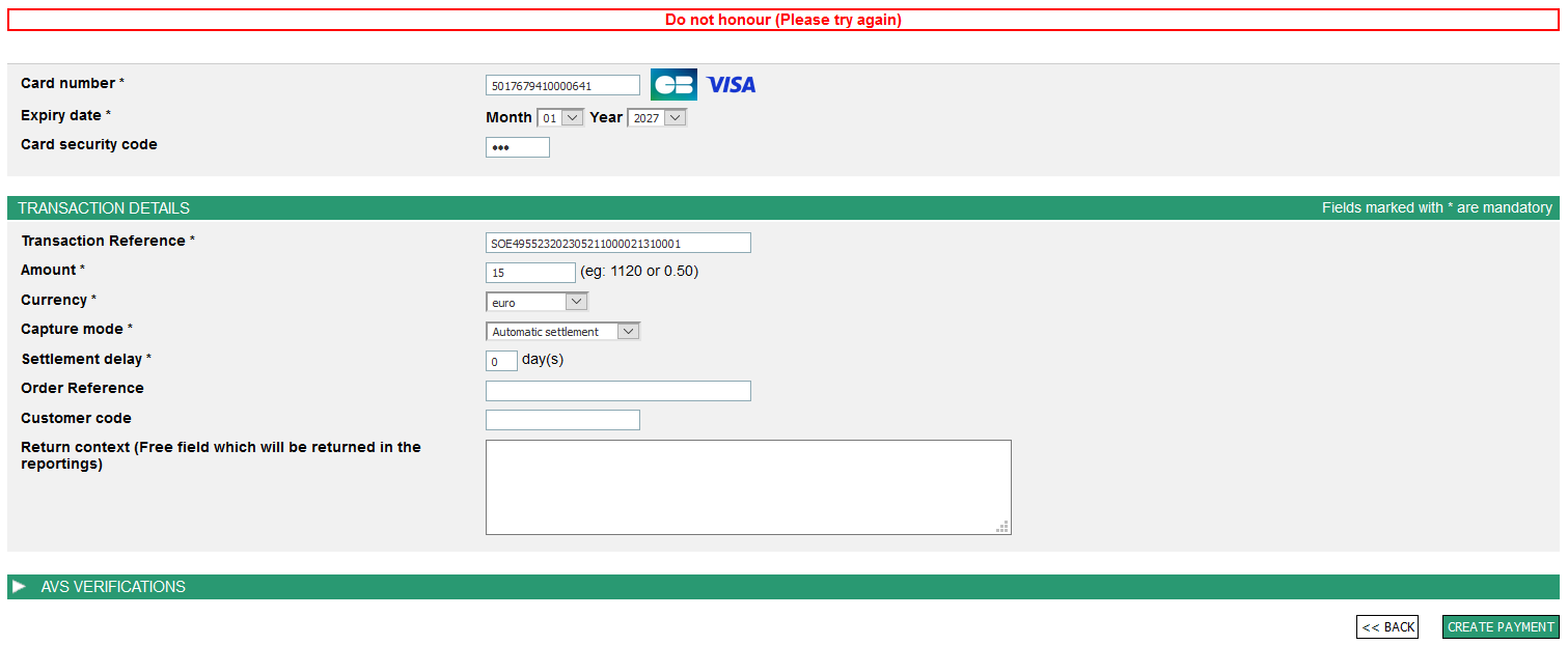 - check the following box if you would like an automatic reversal message to be sent in case of refusal due to an AVS/CSC failure: