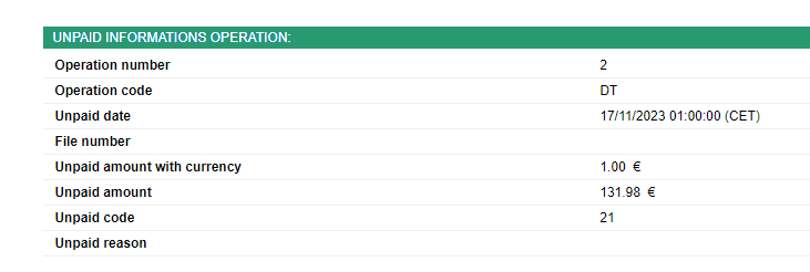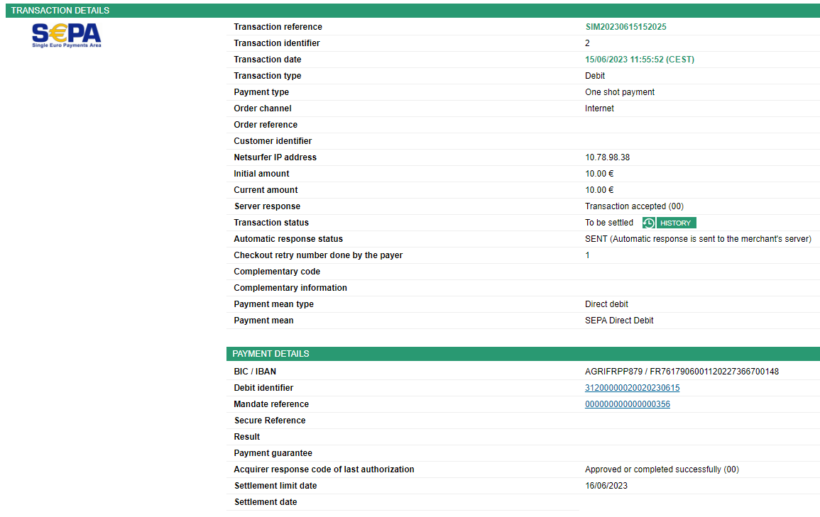 To view the details of a direct debit, click on the ID of the corresponding direct debit. A redirection to the "Transactions" tab will display the details of the SEPA Direct Debit.