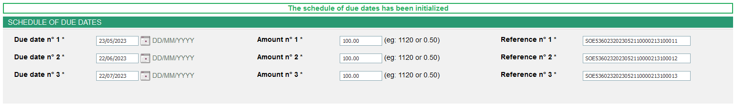 - transaction reference. The reference is saved by default but can be modified (35 alphanumerical characters by default). This reference can be used as a basis for generating the multiple transactions that will be generated.
