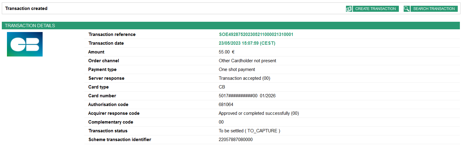Thus, a payment transaction in n times creates n transactions, each with a distinct identifier. Each transaction is independent of the others and includes a systematic authorisation request. In case of agreement, the transaction in question is sent for capture. In case of refusal, the transaction is not submitted again.