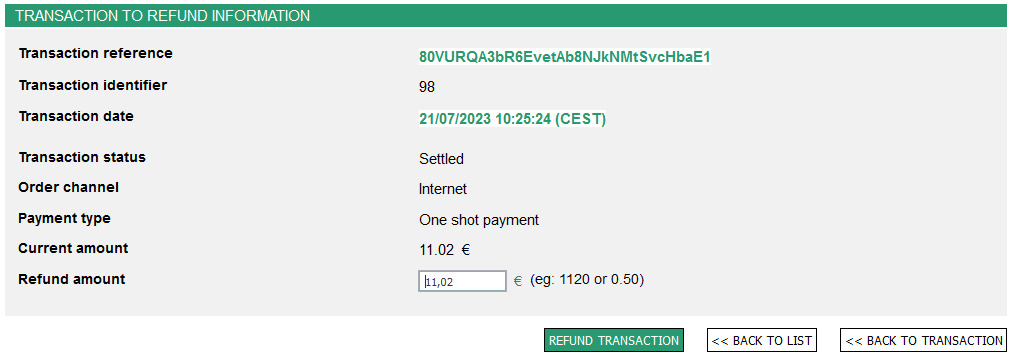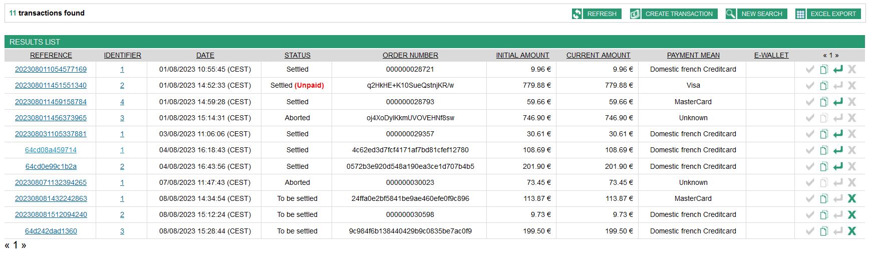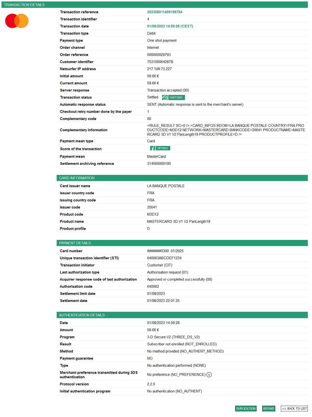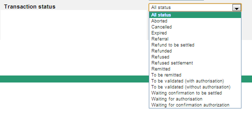 | Duplicating a transaction | To be remitted, to be validated (with authorisation), to be validated (without authorisation), waiting for authorisation, settlement refused, remitted, expired, fraud suspected, refused, refund to be settled, refunded |