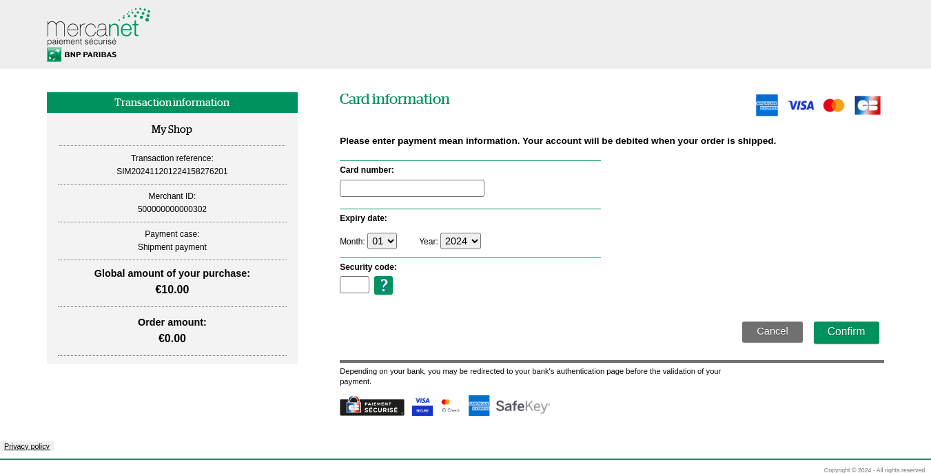 - Mercanet displays the payment page (only payment methods that support multiple payments upon shipping are available), the buyer selects the payment method, provides his/her payment details and then validates.