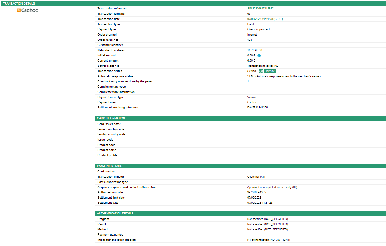 The payment with CB complement is subject to a 3-D Secure payment process. If the card complement is not accepted or the 3-D Secure authentication is not successful, the entire transaction is cancelled and the amount of the prepaid mean of payment is not consumed.
