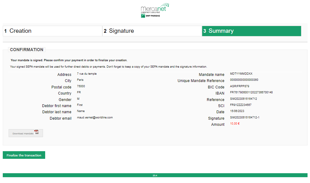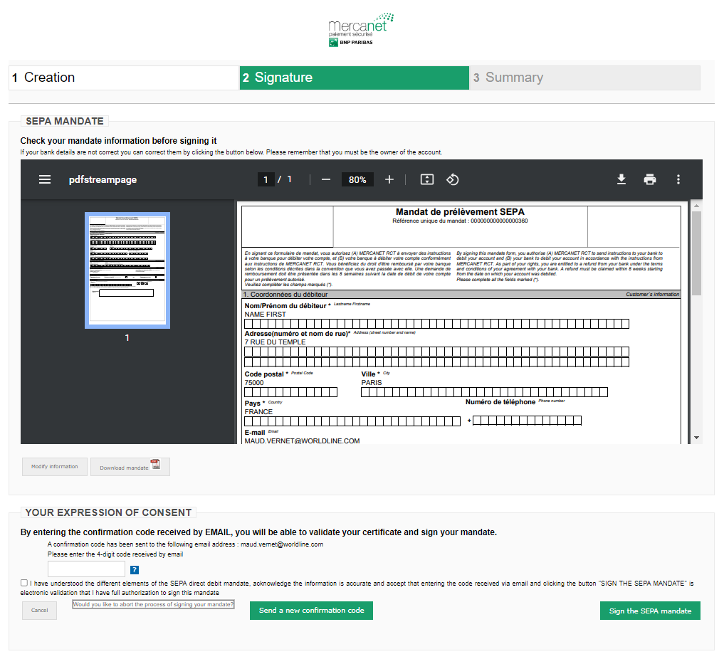 - You have to transmit details related to the customer (identification and contact details), and the customer cannot modify these details during the mandate creation.