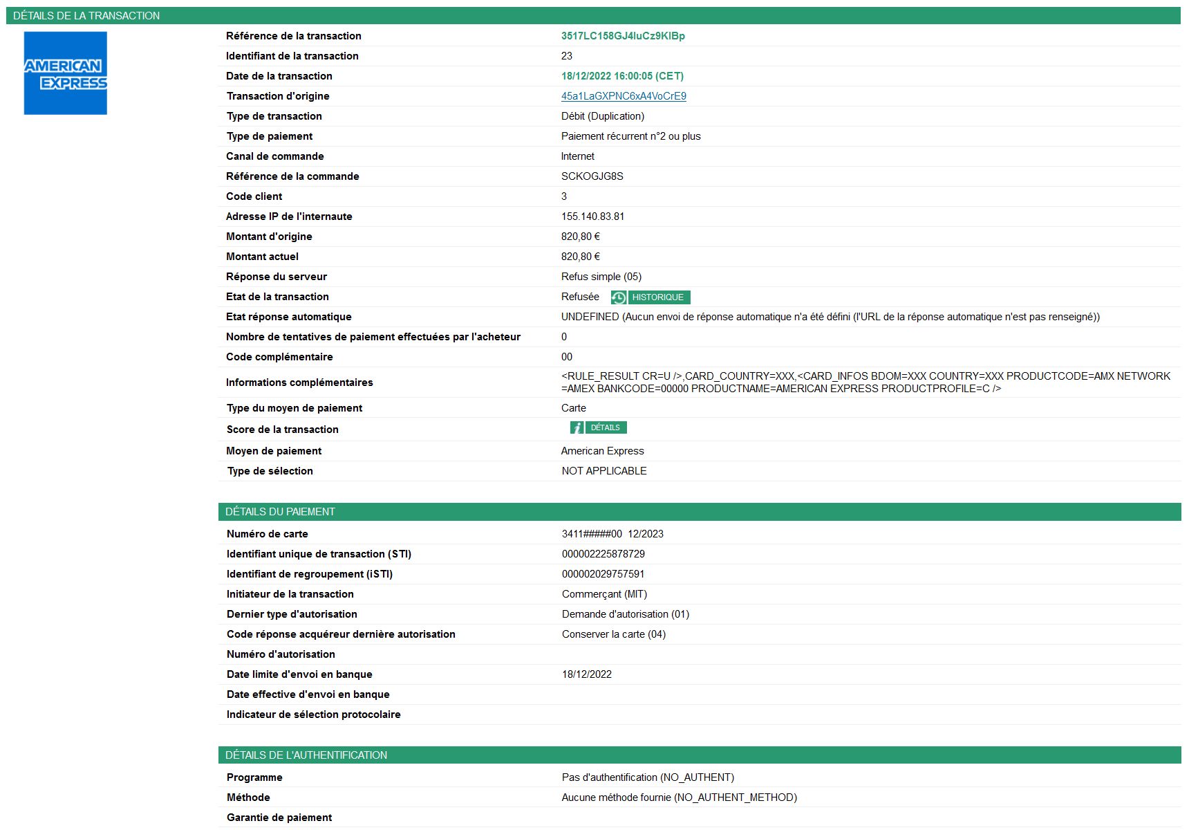 L’autorisation est refusée pour un motif non lié à la fraude, vous pouvez proposer à votre client de payer avec un autre moyen de paiement en générant une nouvelle requête. |