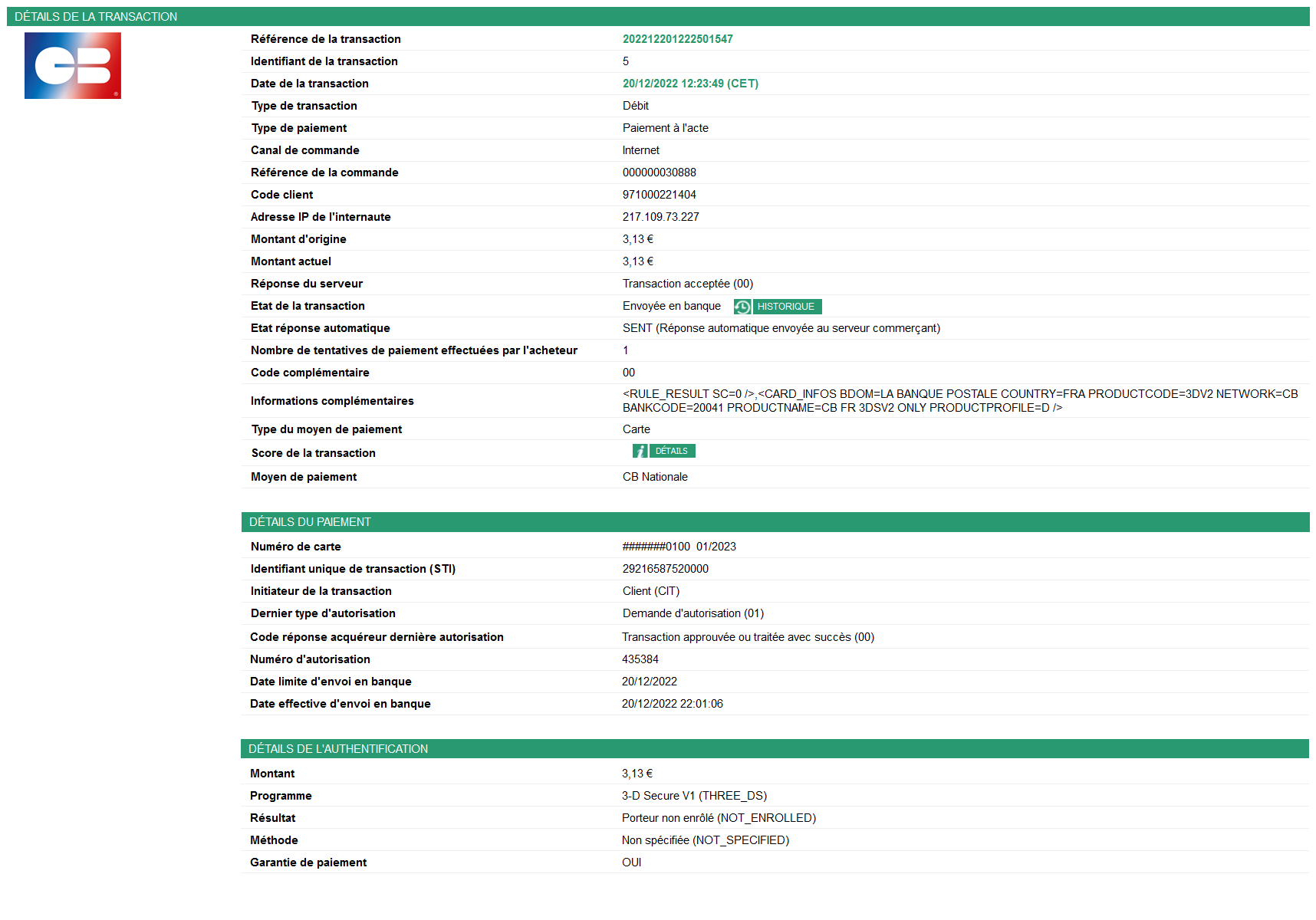 le Dictionnaire des données).paymentMeanBrand = CB ou