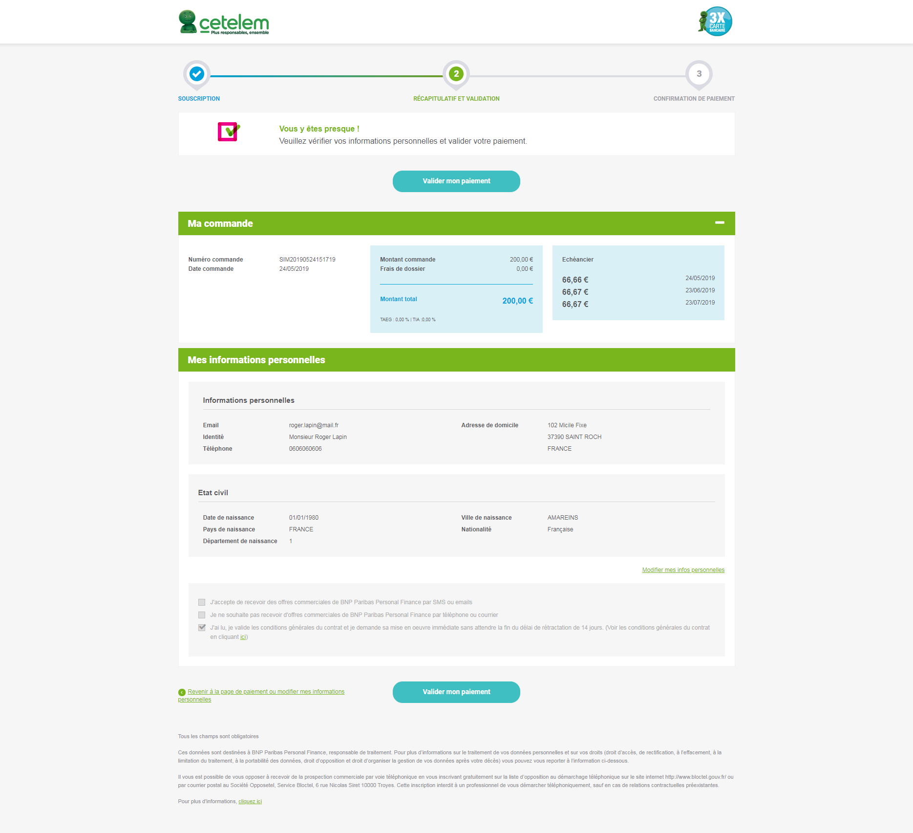 Lors d’un paiement Cetelem 3X 4X CB, le client est redirigé vers l’application d’ouverture de dossier de crédit Cetelem. A la fin de sa saisie, il est informé en ligne du résultat de son paiement.