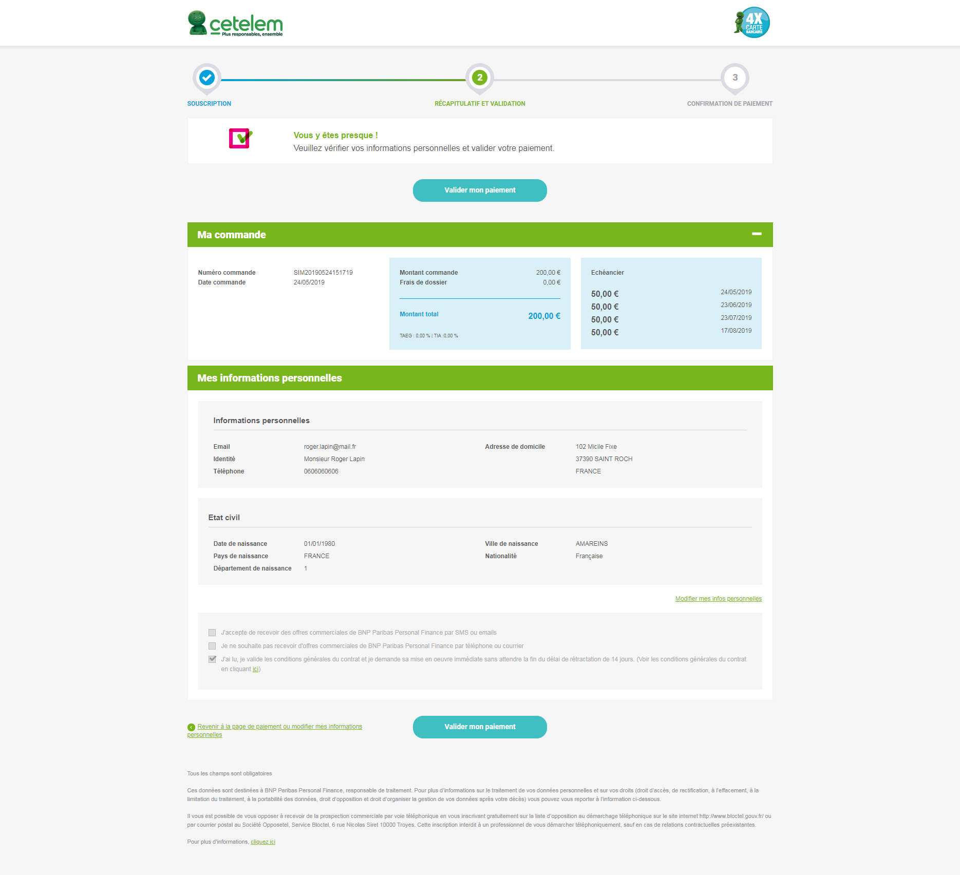 Le client est ensuite redirigé vers la page de la saisie des informations requises pour un paiement Cetelem 3X 4XCB :