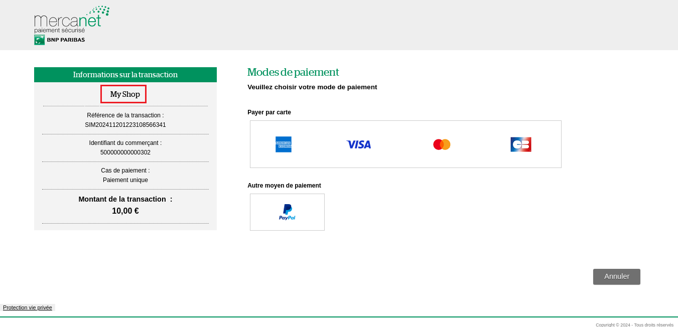 Mercanet est une solution de paiement de commerce électronique multicanale sécurisée conforme à la norme PCI DSS. Elle vous permet d’accepter et de gérer des transactions de paiement en prenant en compte les règles métiers liées à votre activité (paiement à la livraison, paiement différé, paiement récurrent, paiement en plusieurs fois, …).