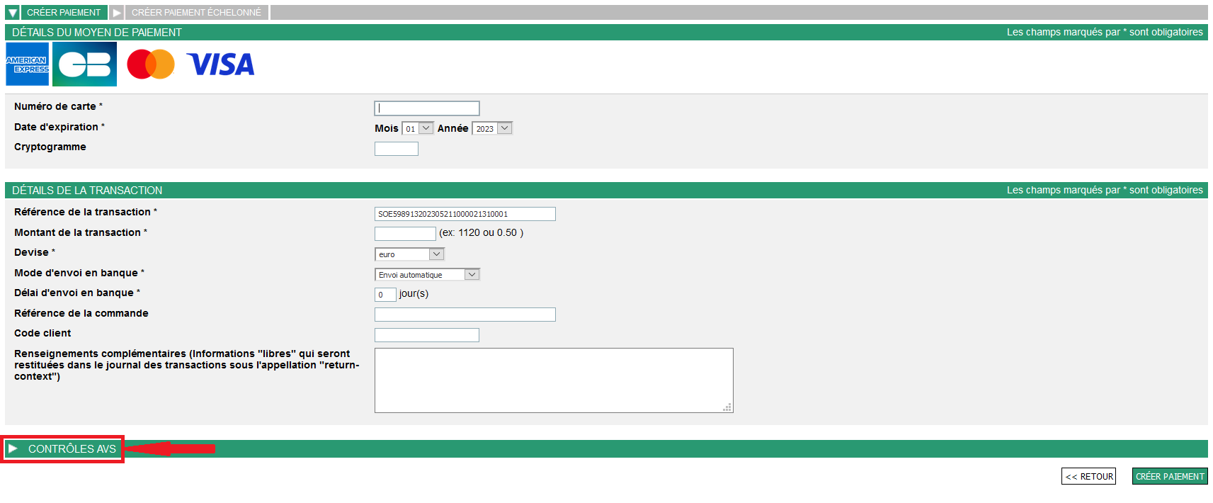 Si vous désirez envoyer les informations nécessaires au contrôle de vérification d’adresse, cliquez sur le bandeau « Contrôles AVS » :