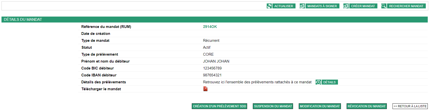 Pour revenir au détail du mandat, cliquez sur le lien "référence du mandat". Pour revenir à l'historique des prélèvements, cliquez sur le lien "identifiant du prélèvement"