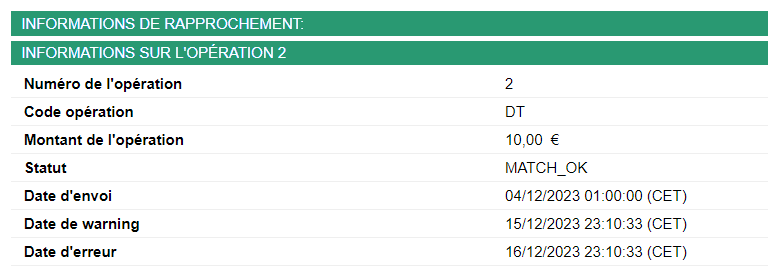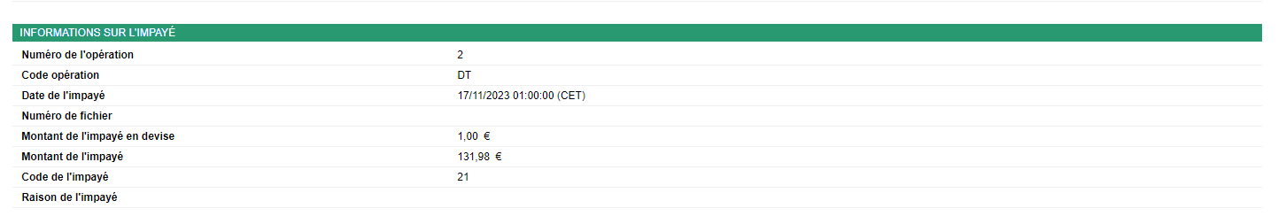 Pour visualiser le détail d’un prélèvement, cliquez sur l’identifiant du prélèvement correspondant. Une redirection sur l’onglet « Transactions » permet d’afficher le détail du prélèvement SEPA Direct Debit.