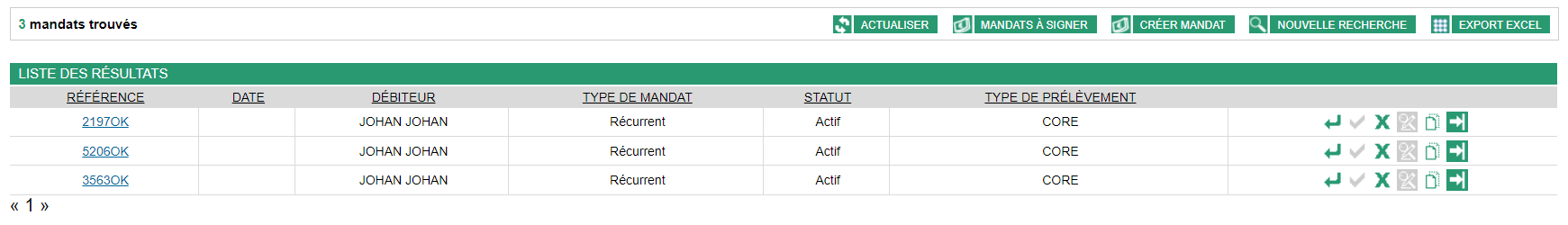 Après avoir effectué une recherche afin de trouver le mandat sur lequel vous souhaitez agir, la liste des mandats correspondant aux critères de recherche saisis s'affiche :