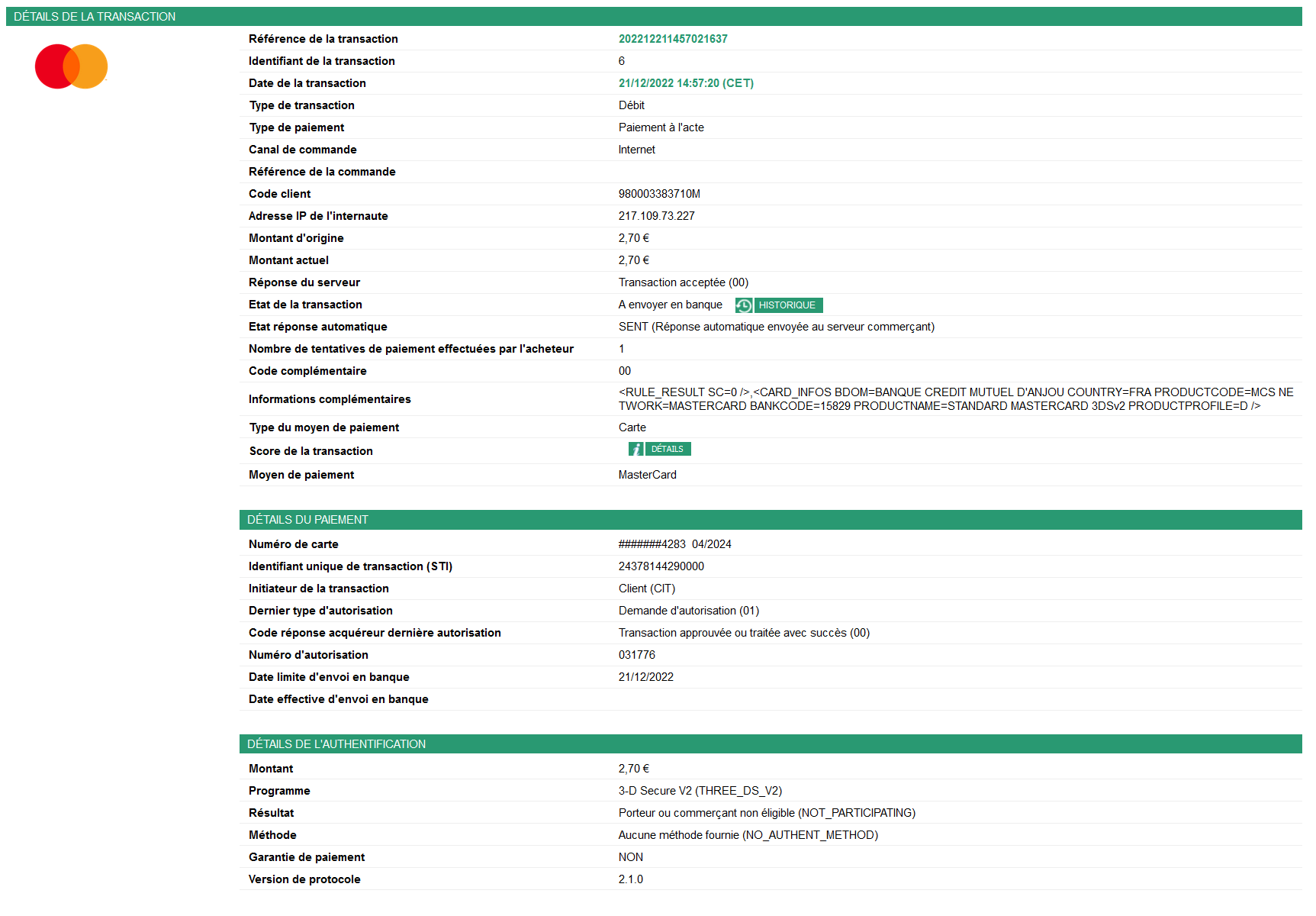 | Dupliquer une transaction | À envoyer en banque, à valider (avec autorisation), à valider (sans autorisation), en attente de demande d'autorisation, envoi en banque refusé, envoyée en banque, expirée, fraude suspectée, refusée, remboursement à envoyer en banque, remboursée |