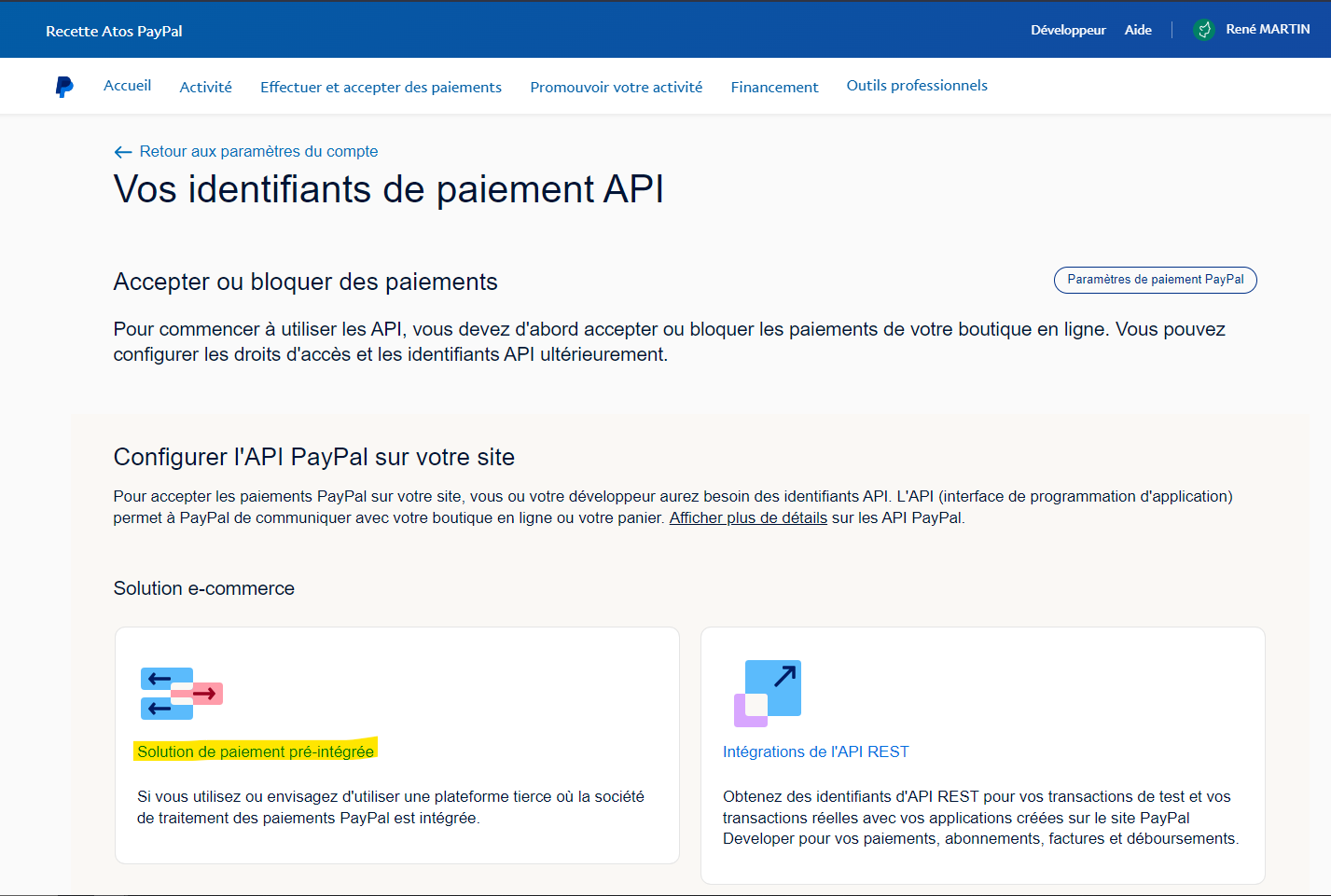 Cliquez sur le lien Solution de paiement pré-intégrée.