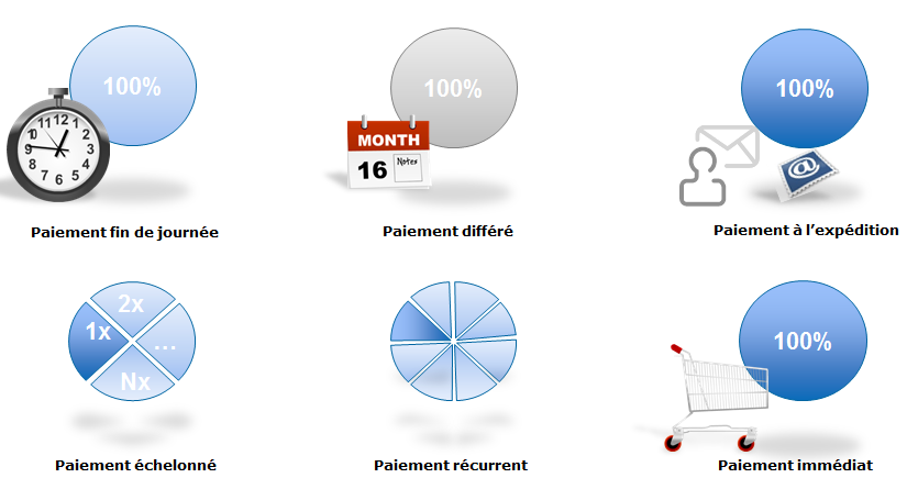 | Moyens de paiement | Tous | CB, Visa, MasterCard, VPay, Maestro, Electron, Amex et Bancontact | La plupart (voir les documentations des moyens de paiement) | CB, Visa, MasterCard, VPay, Maestro, Electron, Amex et Bancontact |