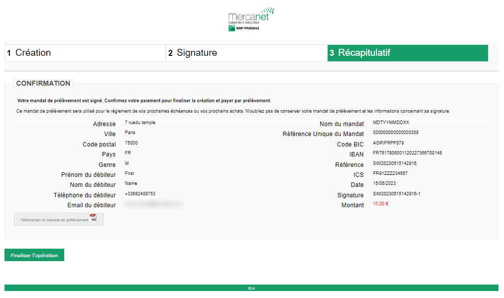 - Si le client ne détient pas de mandat, il lui est proposé de valider son mandat de prélèvement en ligne.