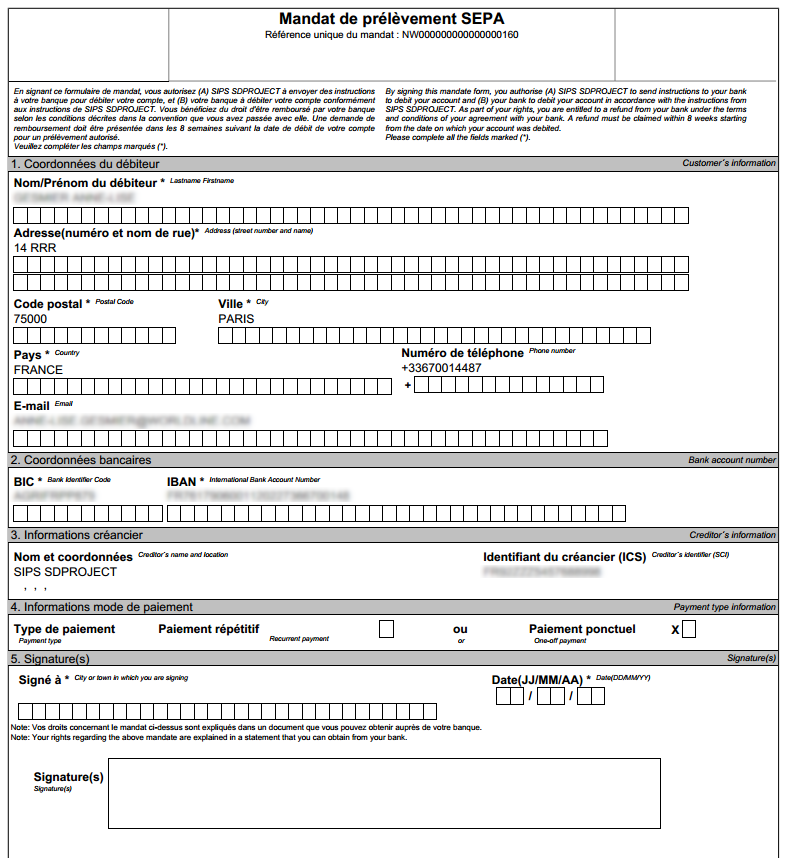 - mandat ponctuel : le mandat n’est valable que pour un prélèvement unique, il expire automatiquement.