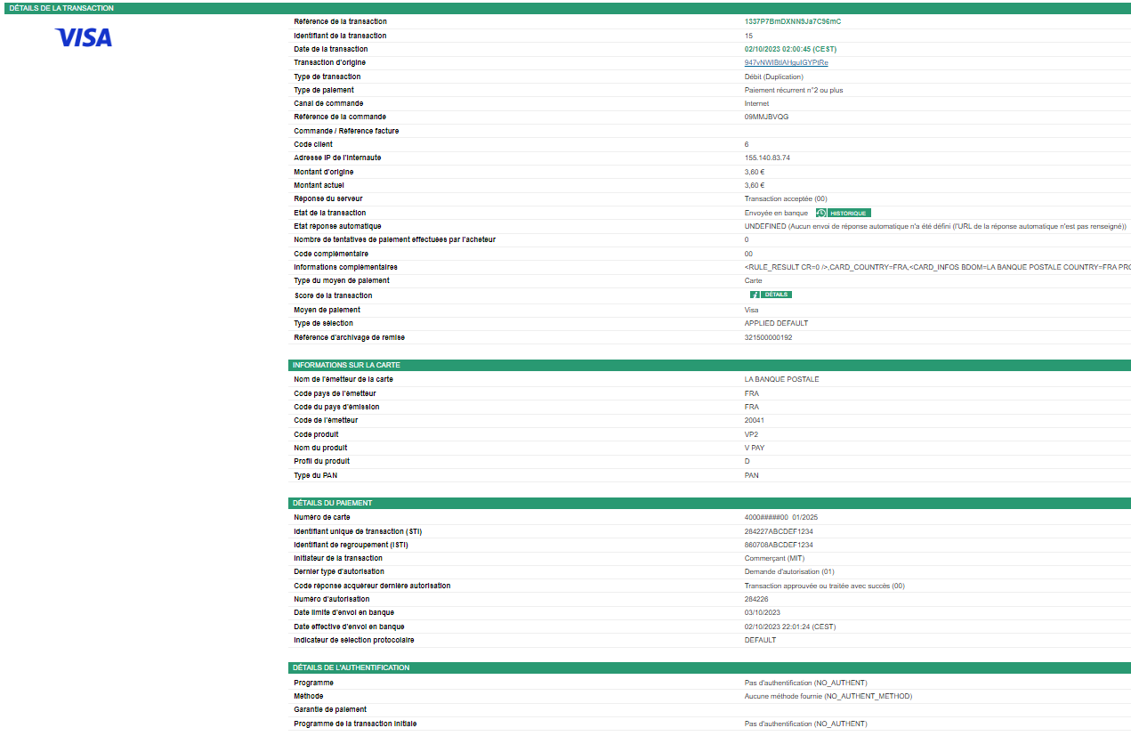 | Paiement accepté | acquirerResponseCode = 00